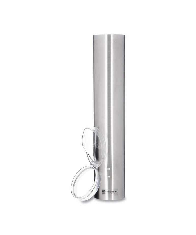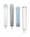 Convenient dispenser provides consistent, one-at-a-time water cup dispensing. Self-adjusting diameter ring accommodates a range of cup sizes. Top-loading, flip-cap design simplifies stocking.