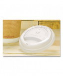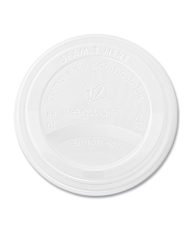 Sip-through lid for Vegware™'s 89-Series hot cups. A lid for hot coffees or teas to go. Point the "seam here" to the inner cup seam. Made from CPLA, a renewable material made from plants. Award-winning quality by Vegware™, made from plants. Commercially compostable where accepted.