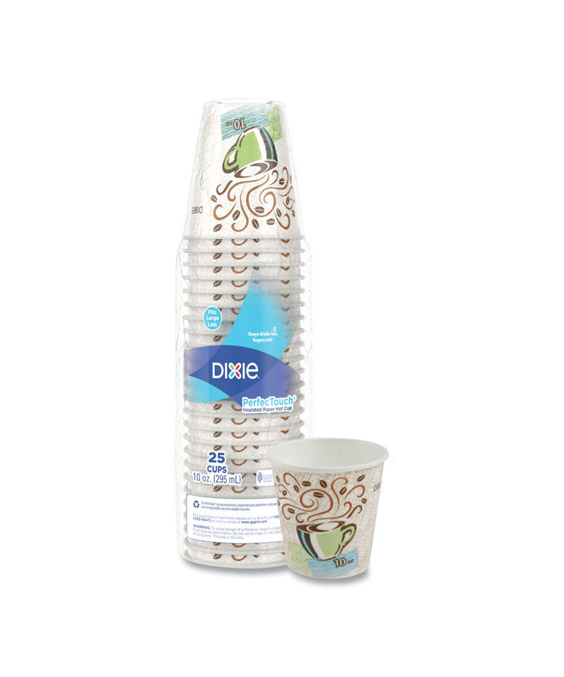 Dixie® PerfecTouch® Insulated Paper Hot Coffee Cups are designed to help extend consumption time by keeping hot drinks warmer longer, helping improve overall product quality. The outer lining of these hot paper cups helps keep hands comfortable to the touch, eliminating the need for double-cupping or cup sleeves, which can help reduce waste and minimize overall cost. Insulated hot paper cups keep drinks hot and fingers cool. More hygienic because they are one-time use compared to permanent ware cups. Dual-purpose paper cups help with storage constraints and simplify ordering.