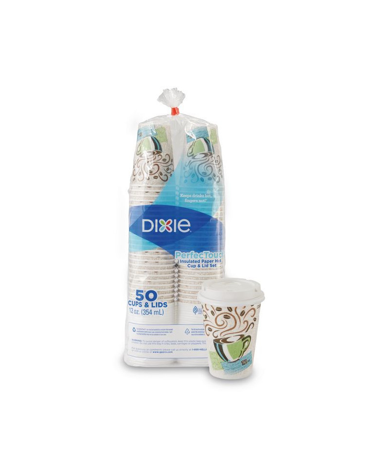 Dixie® PerfecTouch® Insulated Paper Hot Coffee Cup and Lid Sets include cups and matching lids for easy ordering. Dixie® PerfecTouch® Insulated Paper Hot Coffee Cups are designed to help extend consumption time by keeping hot drinks warmer longer, helping improve overall product quality. The outer lining of these hot paper cups helps keep hands comfortable to the touch, eliminating the need for double-cupping or cup sleeves, which can help reduce waste and minimize overall cost. Dixie® Large Dome Plastic Hot Cup Lids have a sip-through opening to help your customers enjoy hot beverages while helping protect against splashes. Use the condiment identifier to mark the coffee lid for easy identification.