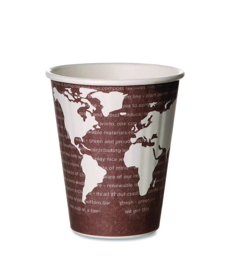 Put the world in your customers' hand when you choose the attractive World Art™ cup design. Double-wall construction provides heat protection and insulation. Lined with PLA, a plant-based plastic.