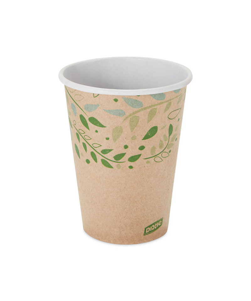 Dixie EcoSmart 100% recycled fiber hot/cold cups are made of post-consumer recycled fiber, designed to help you meet your sustainability goals while providing customers with attractive, sustainable disposable packaging. These cups are both recycled and recyclable and feature a unique kraft paper design that looks great. These dual-purpose paper cups are not only great for hot beverages, but they also have an exterior coating that makes them great for cold drinks.