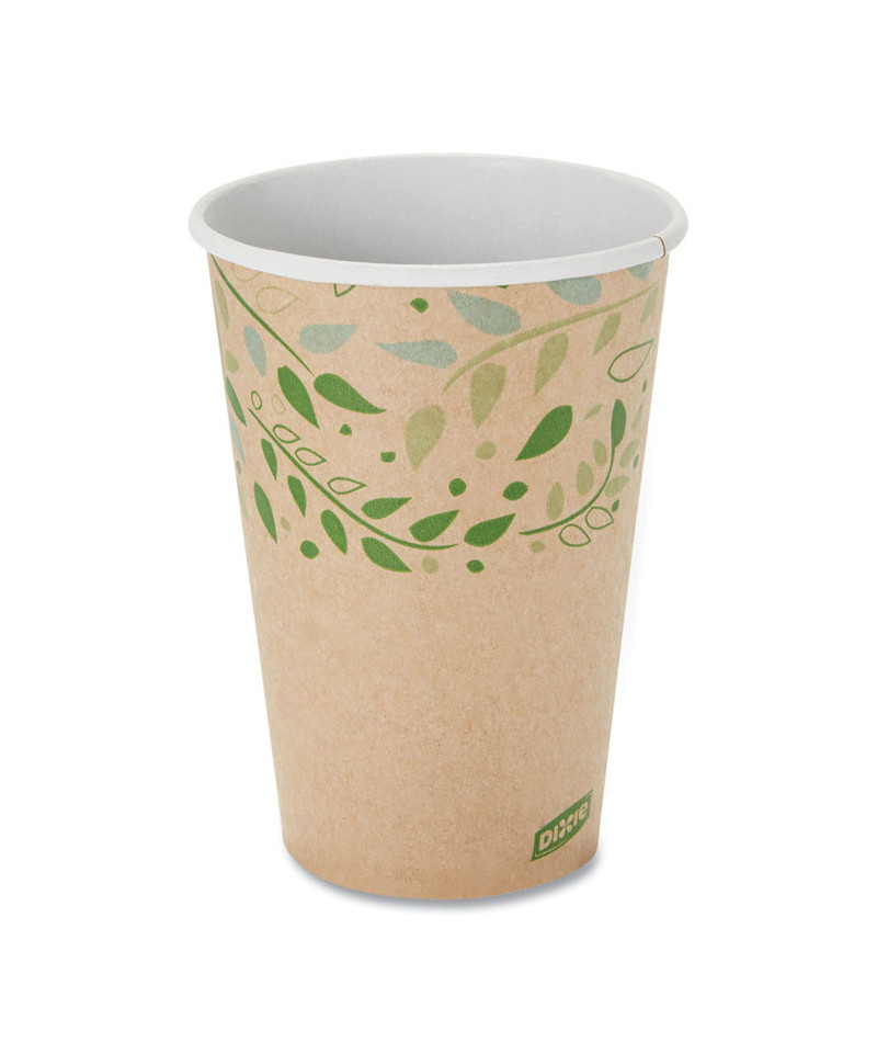 Dixie EcoSmart 100% recycled fiber hot/cold cups are made of post-consumer recycled fiber, designed to help you meet your sustainability goals while providing customers with attractive, sustainable disposable packaging. These cups are both recycled and recyclable and feature a unique kraft paper design that looks great. These dual-purpose paper cups are not only great for hot beverages, but they also have an exterior coating that makes them great for cold drinks.