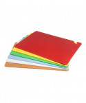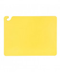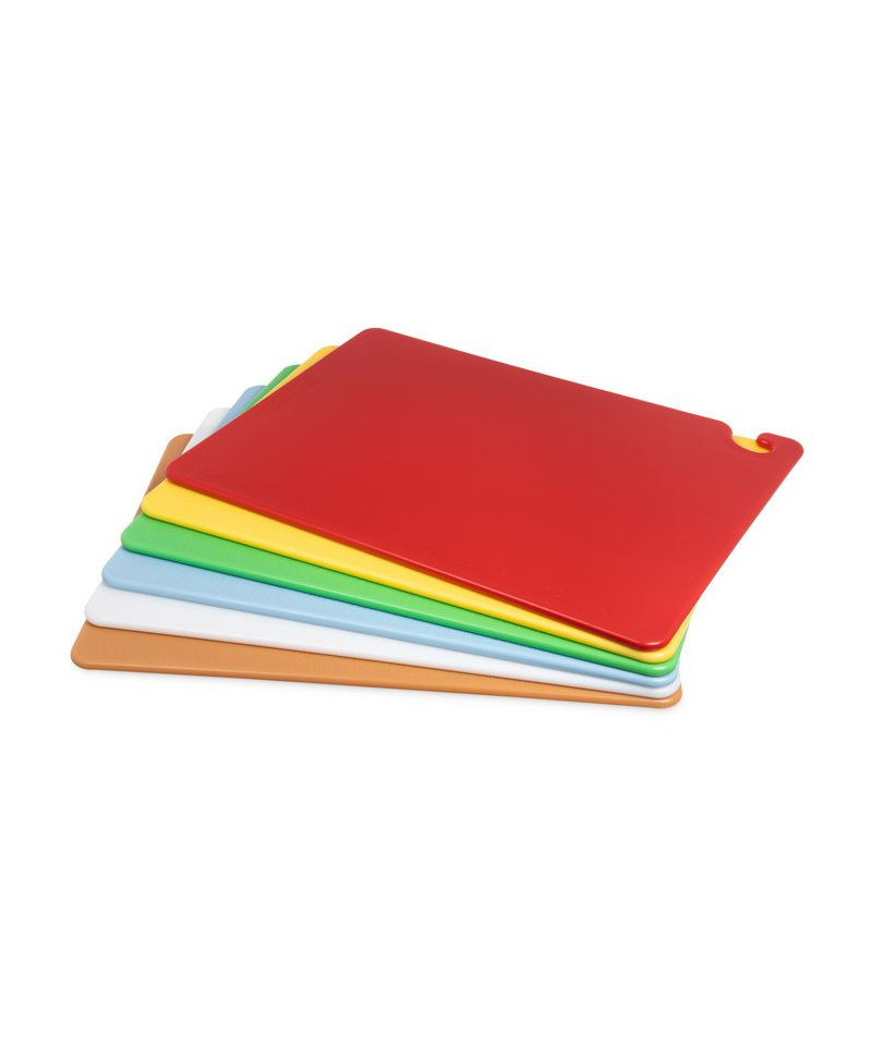 Cutting board with food safety hook offers secure handling without touching prepped ingredients. Molded-in ruler helps create uniform cuts of vegetables and fruit. HACCP color-coding in assorted colors minimize cross-contamination by dedicating each color to meat, poultry, vegetables, and more. Warp-resistant withstands high temperatures of commercial dishwashers. Co-polymer blend is formulated to decrease knife dulling.