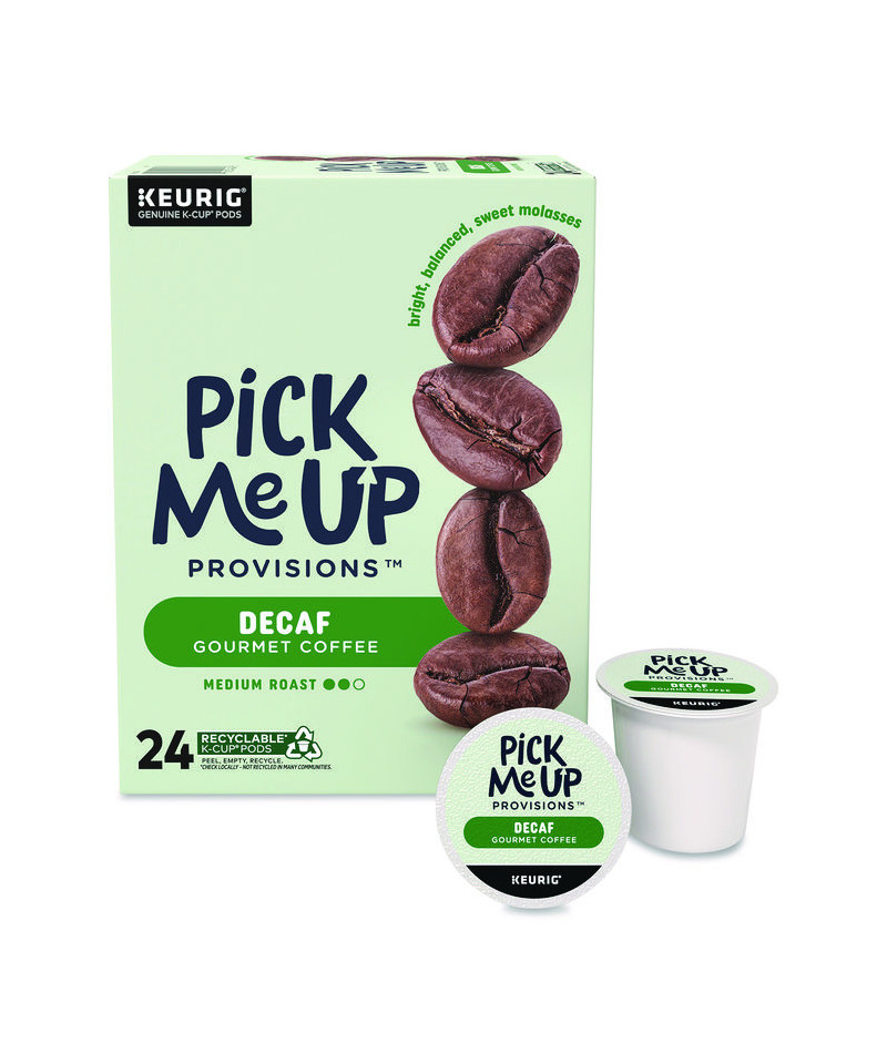 Brew your perfect cup with our convenient decaf K-Cups.? Enjoy the flavor you crave in a cup of decaf coffee with award-winning Pick Me Up Provisions™ Decaf Medium Roast. Every?K-Cup?contains a well-balanced, sweet and citrusy single serving of?medium roast?coffee with no artificial colors or flavors. Grab Pick Me Up Provisions™ Decaf Medium Roast for a cup of decaf coffee everyone will love, whether at home or in the office!