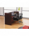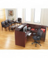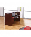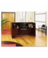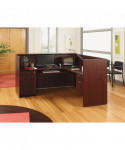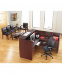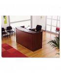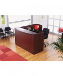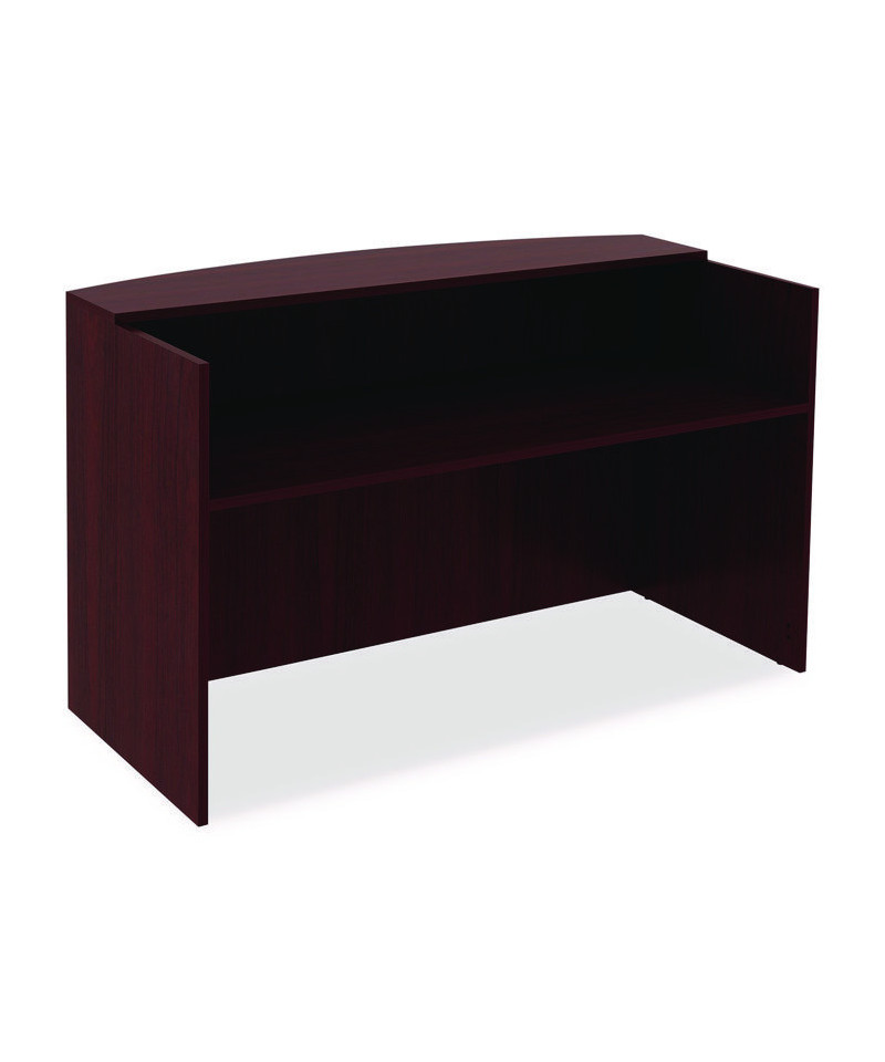Ideal for transacting business or welcoming guests. Commercial-grade laminate work surface and side panels are water-, scratch- and stain-resistant. Bow-shaped transaction counter and high-sided panels for privacy. Protective 3mm edge banding helps prevent damage from bumps. Two grommets for cable and wire management. Leveling glides help compensate for uneven floors.