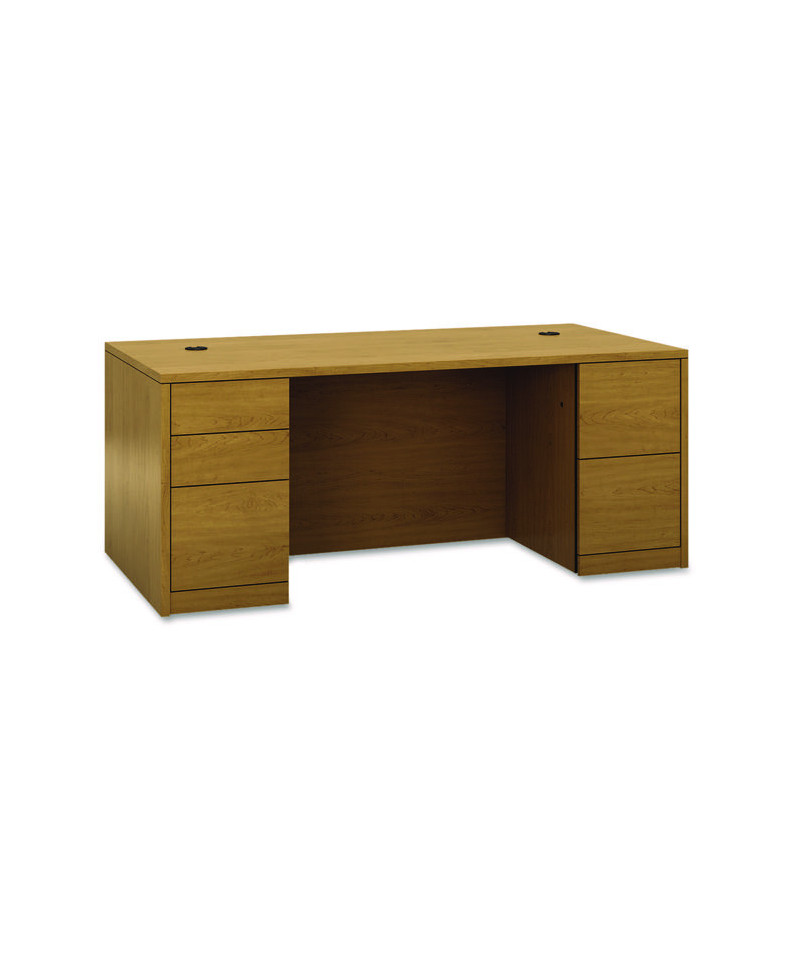 Hard-working, good-looking and built to survive a lifetime of overtime. 10500 Series™ Double Pedestal Desks feature premium, scratch-and stain-resistant, thermal fused laminate surfaces that stand up to just about anything: dropped objects, spills, even boiling liquids. All drawers operate on smooth-rolling ball-bearing suspension systems to ensure reliable access to your materials. File drawers extend fully and accommodate letter- or legal-size hanging files; spacious box drawers extend three-quarters. Clean, square corners and flat-edge profiles deliver a classic, streamlined look that integrates seamlessly with almost any HON® office suite or workstation component. HON® "One Key" core removable locks make re-keying quick and easy. Full-height modesty panel provides extra privacy, and two worksurface grommets make it easy to route and conceal your cables and power cords.