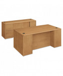 A modular management solution that combines stylish profiles and elegant accents with top-grade fit and finish. Abrasion- and stain-resistant high-pressure laminate with elegant hardwood trim. Drawers ride on steel ball bearing suspensions; file drawer extends fully and accommodates letter and legal size hanging files, box drawers extend three-quarters. HON® “One Key" core removable locks make re-keying quick and easy. 10-1/2" conference overhang provides added kneespace for guests. Full-height modesty panel for privacy. Convenient cable management with two worksurface grommets.