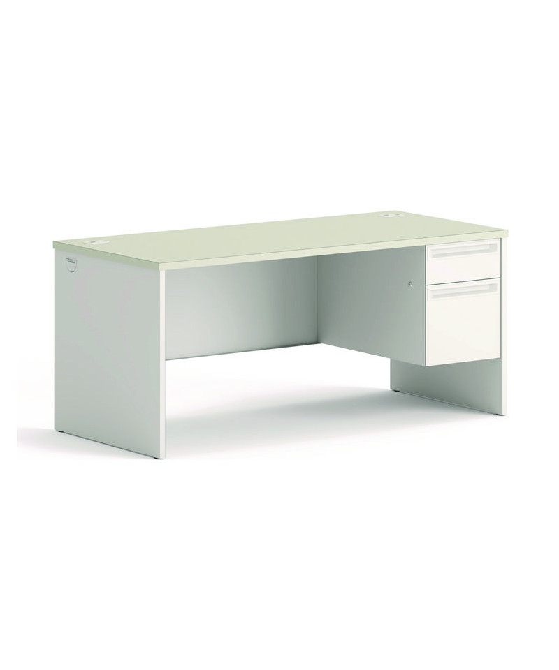 High-pressure laminate top is moisture-, scratch- and stain-resistant. Tru-fit mitered drawers operate on heavy-duty steel ball bearing suspensions. High-sided file drawer extends fully and accepts hanging files without hang rails; box drawer extends three-quarters. HON® "One Key" core removable locks. Two work surface grommets help control cord and wires. Three-quarter height modesty panel for privacy.