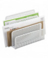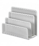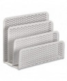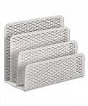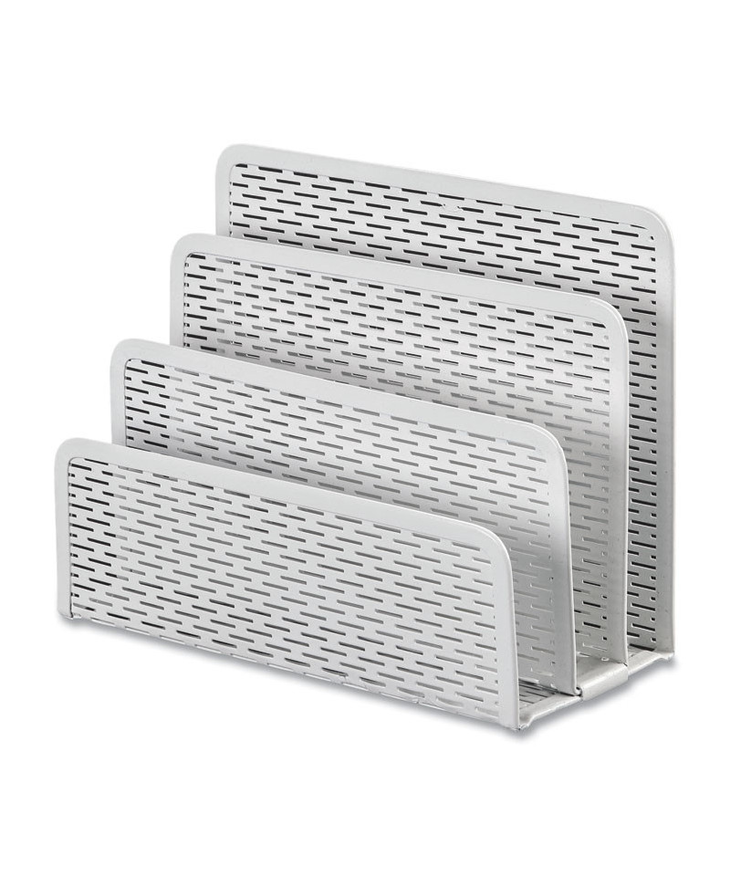 Strong, professional grade punched metal with decorative urban style slotted pattern. High quality satin finish complements any décor. Features protective feet to prevent surface wear and scratches on the desktop surface. Reinforced rounded edges provide durability and attractive detailing. Provides three compartments to sort letters, memos, or other materials helping to organize your desktop and reduce clutter.