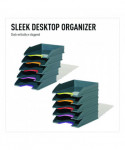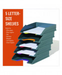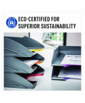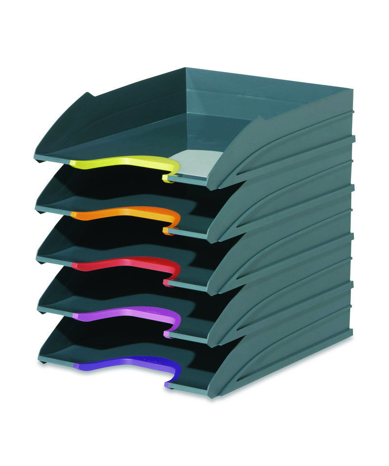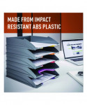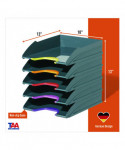 The VARICOLOR® Stackable Letter Tray Set from DURABLE® is a versatile storage solution that streamlines your organization and productivity. The five color-coded trays keep all your essential documents neatly organized, whether it's paperwork, files, mail, brochures, notepads, important documents and more. Maintaining a clutter-free workspace is effortless – simply place it directly on your desktop to ensure essential paperwork is always within reach. For those seeking even greater space optimization, stack multiple units together – they can be stacked either vertically or staggered. Alternatively, seamlessly integrate them into standard office storage cabinets, sideboards, and bookcases for a streamlined and organized workspace. Crafted with premium, long-lasting plastic, VARICOLOR is designed to stand the test of time, making it the perfect solution for high-traffic environments where document handling is frequent. This VARICOLOR Stackable Letter Tray Set is Blue Angel certified, a globally recognized standard. Awarded by the German government, Blue Angel certification ensures that this item meets rigorous criteria for sustainability, health, and performance. By choosing this product, you're supporting responsible manufacturing practices Each tray has a colorful cut out so you can easily locate and grasp your files. The anti-slip base pads provide stability and protection, preventing slips and desktop scratches. VARICOLOR is the perfect solution for a wide range of environments, ideal for organizing documents in offices, schools, restaurants, hotel front desks, retail stores, banks, hospitals, maintenance offices, legal offices, senior living homes, warehouses, manufacturing, industrial settings, and even at home. For over 100 years, DURABLE has been synonymous with quality, design, and functionality. As an international workplace expert with German roots, we create reliable products built to last. Our commitment to sustainability is embodied by our RETHINK mindset, integrating the four R's (Refuse, Reduce, Reuse, Recycle) into every aspect of our process. Continuing this legacy, DURABLE aims to lead with purpose and responsibility, crafting solutions with lasting value.