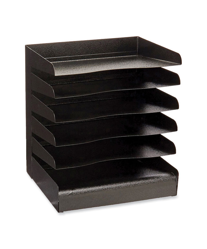 The Steel Desk Tray Sorter is a six-shelf desk organizer built with a sturdy steel construction. The steel desk tray offers slanted shelves with finger cutouts and a fingerprint resistant surface. The steel desk tray organizer includes rubber feet to protect workspace surfaces.