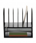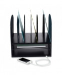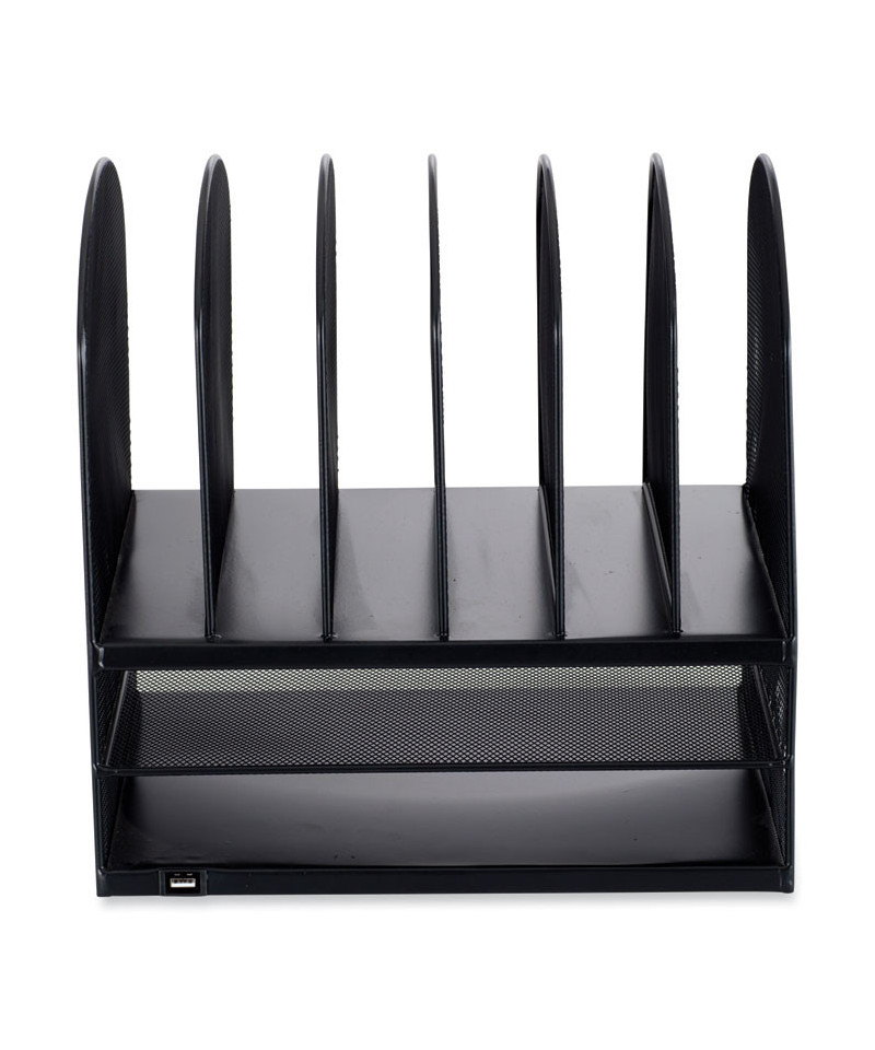 This organizer features a USB port to easily charge your electronics. Durable, designed with steel mesh construction. A versatile filing center that is designed with two horizontal trays for letter-size documents and six large-capacity vertical sections for file folders and binders. Includes USB cord and power cord to plug into wall.