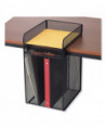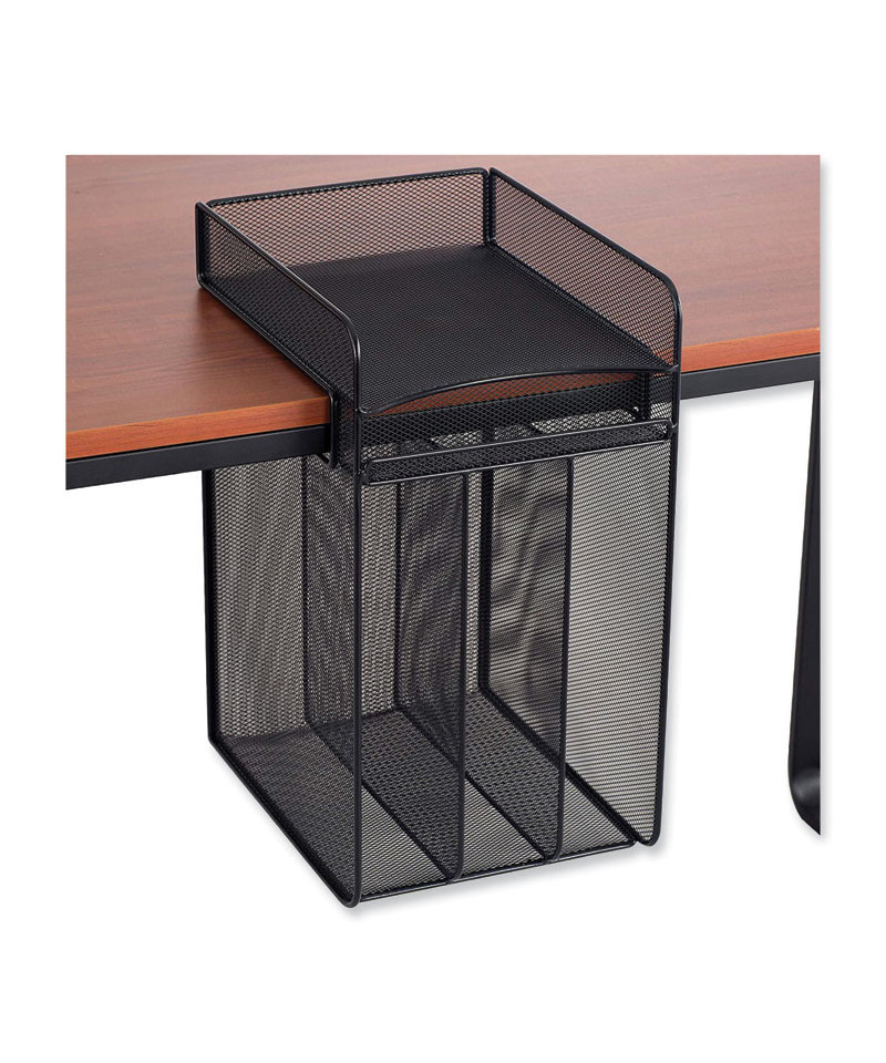 The Onyx™ horizontal hanging storage unit is a wire mesh organizer that easily attaches to a desktop and hangs below it, providing underdesk storage that saves space and time. Features one desktop tray and three underdesk trays for sorting letter-size documents, folders and files. It also has an underdesk pencil tray for storing pens, pencils and other supplies. The hanging storage design keeps your desktop clutter free and pairs well with standing-height or adjustable-height desks or tables. This sleek mesh organizer attaches to surfaces up to 1.75 thick and includes a rubber-headed tightening screw so that it can be securely mounted without damaging the surface. Created with a steel base and powder coat finish for added durability.