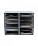 The ultimate paper tray organizer system for paper, notebooks, magazines, craft paper, notes, binders, and more. The Thinkspace Configurable Paper Tray System includes a set of 12 paper trays and 3 lids to customize and fit into any space necessary. Easily snap together trays horizontally or vertically in any combination to suit any space. Store on desktops, countertops, or shelves to maximize space to organize a workspace, home office, or classroom. The minimalist gray tray system is perfect for any professional office.