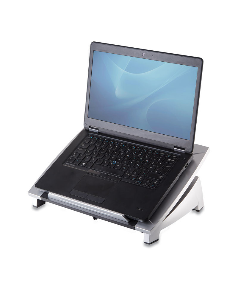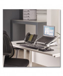 Fellowes Office Suites Laptop Riser features an adjustable tilt riser that provides the optimal keyboard level and viewing angle. Front bar holds laptop in place and keeps it from sliding forward. Durable plastic platform can support a 17" laptop or up to 10 lbs. Perfect for use in the office, home office, or wherever you would like to raise your laptop to a convenient position.