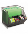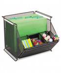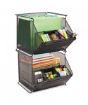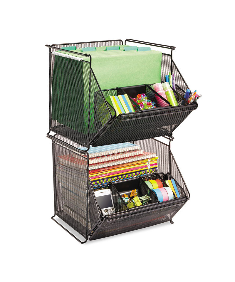 Sturdy, stackable mesh bin accommodates storage needs from office supplies to letter-size hanging file folders and everything in between. Stacks up to two high to optimize space. Detachable accessory organizer can mount on the front or the back and allows even the smallest supplies to be kept neat and within easy reach. Organizer includes two dividers and one divider tray.