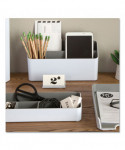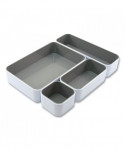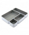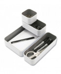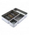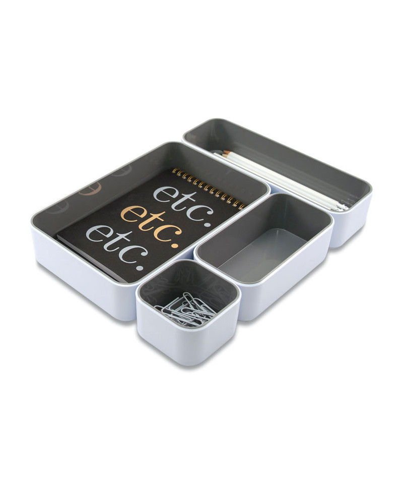 Perfect for organizing drawers, used together or separately. High-gloss, rolled edges provide bold contrast and sleek, modern design. Plastic-infused durability. Versatile in multiple environments such as office, bedroom, and bathroom. White exterior with gray interior. Set includes one 3 x 3 tray, one 3 x 6 tray, one 3 x 9 tray and one 6 x 9 tray.