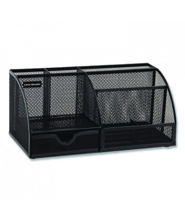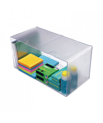 A unique storage piece that incorporates several different types of organizational styles. The large in/out letter tray on top is great for files and papers. The open slot in the front can house frequently used reference materials. The two small drawers hold small knickknacks, while the large drawer can handle larger office supplies. The brushed metal knobs, frosted glass accents and hand-finished matte black surface give the this tower a modern look, making it a centerpiece for your desk.