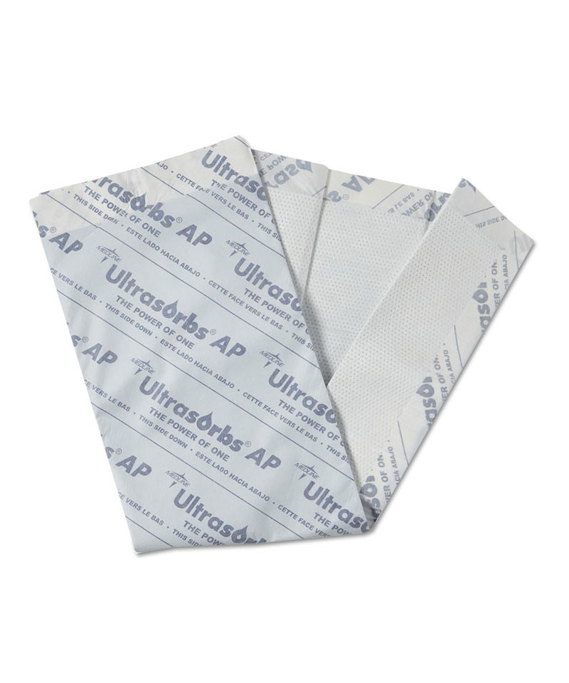 Ultrasorbs AP® help manage moisture and help maintain skin integrity over time. Extra-large pad draws in moisture, locks it away from the skin. Feels dry to the touch in just minutes after wetting. AquaShield film provides leakage protection, resulting in fewer linen changes; with no double-padding needed. Lies flat when wet without bunching, swelling or disintegrating. Air-permeable for added patient comfort. Effective for use with low air loss mattress therapy—protects the bedding and permits air flow.