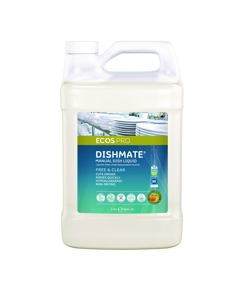 This highly effective ECOS PRO Dishmate manual dishwashing liquid cleans and cuts grease without drying out skin. The unique formulation leaves less residue on dishes for a quicker rinse time and reduction in water usage. The hypoallergenic, pH-balanced formula is made using sustainable, plant-derived surfactants. The product is free of dyes and is gray water and septic safe. Not tested on animals. Manufactured in a facility that is LEED Zero Carbon, LEED Zero Waste and LEED Zero Energy Certified.