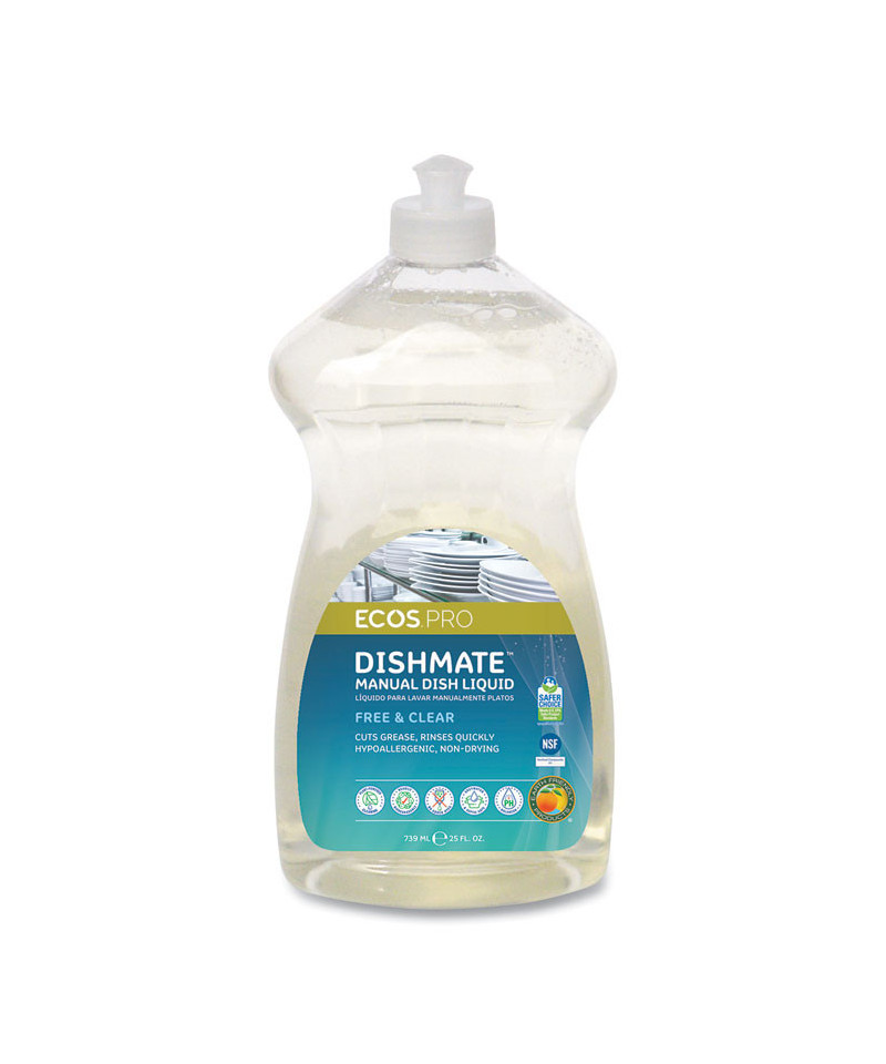 This highly effective ECOS PRO Dishmate manual dishwashing liquid cleans and cuts grease without drying out skin. The unique formulation leaves less residue on dishes for a quicker rinse time and reduction in water usage. The hypoallergenic, pH-balanced formula is made using sustainable, plant-derived surfactants. The product is free of dyes and is gray water and septic safe. Not tested on animals. Manufactured in a facility that is LEED Zero Carbon, LEED Zero Waste and LEED Zero Energy Certified.