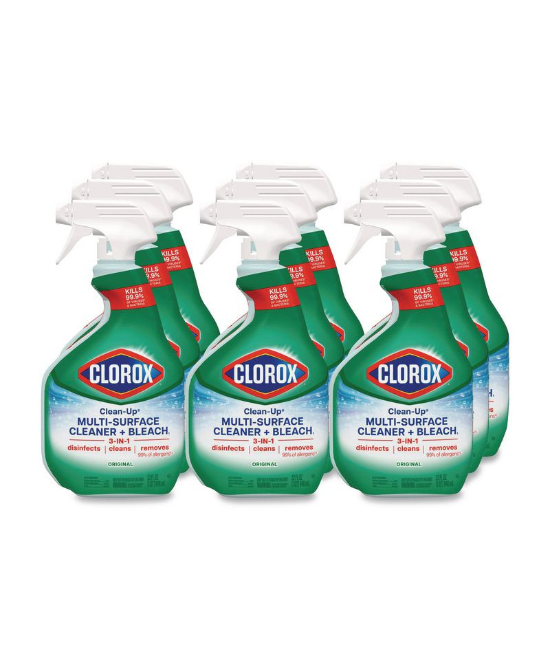 Get the power of bleach in an everyday cleaner. Clorox® Clean-Up® Multi-Surface Cleaner with Bleach is a 3-in-1 product that disinfects, cleans and removes 99% of allergens. Get a powerful clean with one bottle that tackles common messes like dirt, grease and food stains like juice, coffee or tea. It even eliminates the toughest stains the first time, no scrubbing required. Use this hardworking cleaner on a variety of surfaces like stainless steel, glazed ceramic, sealed granite, glazed porcelain, enamel and fiberglass, but avoid prolonged contact with porcelain. Not just for messes, this disinfectant spray also kills 99.9% of bacteria and viruses commonly found in the office when used as directed on hard, nonporous surfaces. Dirty floors, greasy countertops, and soapy bathroom surfaces are no match for Clorox® Clean-Up® Multi-Surface Cleaner with Bleach.