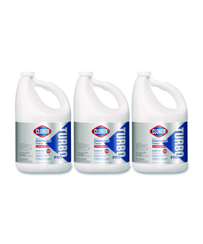 This bleach-free formula disinfects high-touch surfaces quickly and easily. Ideal for a wide array of facilities such as kitchens, restrooms, salons, clinics, schools, and offices. When used with a sprayer device, all you have to do is spray, there's no wiping required. This EPA-Approved disinfectant kills 99.9% of germs and viruses (Pseudomonas aeruginosa (Pseudomonas), Salmonella enterica (Salmonella), Staphylococcus aureus (Staph) Rhinovirus Type 14, Rhinovirus Type 39, Avian Influenza Virus (H5N1)), including SARS-CoV-2, the virus that causes COVID-19 on hard, non-porous surfaces when used as directed. The formula also kills 99.9% of bacteria (Staphylococcus aureus (Staph), Klebsiella pneumonia (Kleb)) in five seconds and prevents the growth of odor-causing bacteria for up to 24 hours. The Clorox Turbo Pro Disinfectant Cleaner is safe for daily use on high-touch surfaces in your facility. Use on hard, non-porous surfaces like acrylic, chrome, glass, laminate, plastic, stainless steel, vinyl, and soft surfaces such linens, upholstery and mats.