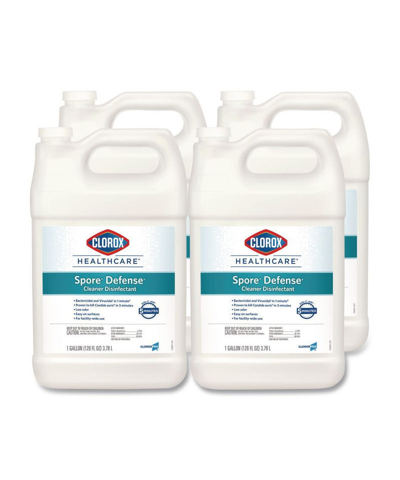 Clorox Healthcare® Spore Defense™ is your low odor, easy-on-surfaces cleaner disinfectant for facility-wide use. This open-system cleaner disinfectant kills 56 microorganisms including C. difficile spores in five minutes and acts as a Bactericidal, Virucidal and Fungicidal in three minutes or less. It is also EPA registered to kill Candida auris, considered an urgent antibiotic resistant pathogen threat by the CDC. This Spore Defense cleaner meets EPA criteria for use against SARS-CoV-2, the virus that causes COVID-19 on hard, nonporous surfaces when used as directed. Compatible with a wide variety of surfaces including acrylic, chrome, aluminum, plastic, vinyl, glazed porcelain, PVC, plastic and stainless steel, this spore cleaner is suited for use on floors, bed frames, infant incubators, showers, stretchers, wheelchairs and more. Ideal for use in clinics, doctor offices, emergency rooms, hospitals, patient rooms and more.