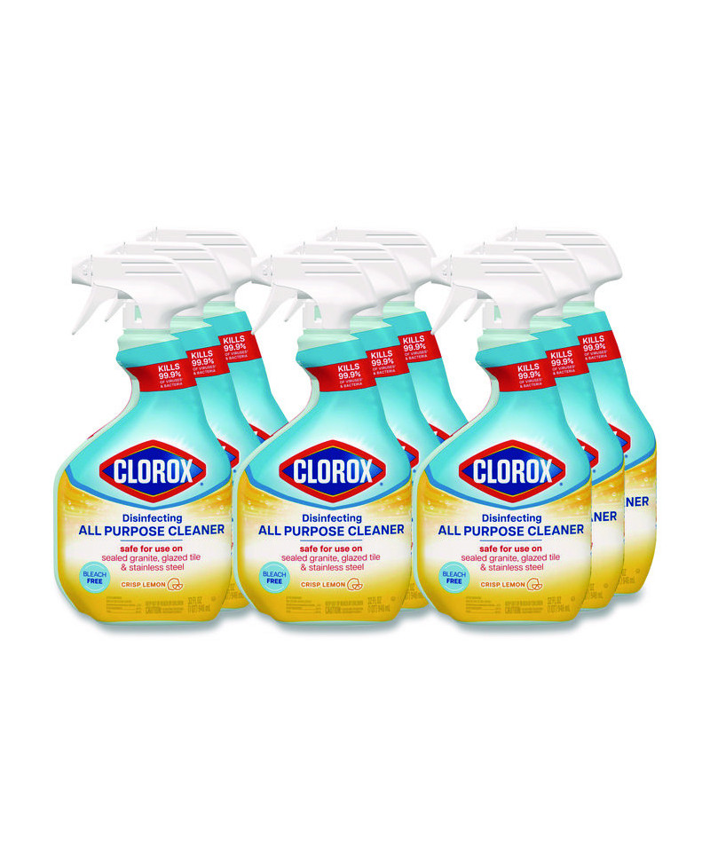 Tackle everyday messes with Clorox® Disinfecting All Purpose Cleaner that cuts through tough grease and grime on a variety of surfaces. Safe to use on multiple hard, nonporous surfaces like kitchen sinks, counters, refrigerators, appliances, tubs, toilets, fiberglass, floors, showers and tile, this disinfecting spray leaves behind a crisp lemon scent without the odor of bleach for a sparkling clean experience in your home. It even kills 99.9% of bacteria and viruses and stops bacteria growth for 24 hours on hard, nonporous nonfood contact surfaces when used as directed. Just see what Clorox® Disinfecting All Purpose Cleaner can handle: dirt, fingerprints, food, oily spills, greasy spatters, messes, food stains, grime, outdoor grime, smudges, soap scum, sticky food and tough soils. Enjoy confidence in a long lasting clean with Clorox® Disinfecting All Purpose Cleaner.