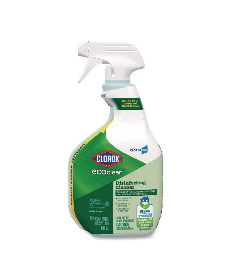 Clean with confidence—thanks to Clorox® CloroxPro® EcoClean Disinfecting Cleaner, you get the cleaning power of Clorox® you expect with a Design for the Environment certified lactic acid active ingredient. This Clorox® disinfecting cleaner kills 99.9% of flu viruses (Human Coronavirus, Influenza A Virus, Respiratory Syncytial Virus) and disinfects and sanitizes when used as directed. It kills SARS-CoV-2, the virus that causes COVID-19, in 30 seconds on hard, non-porous surfaces when used as directed and is formulated without bleach, alcohol, phosphates, quats and dyes, leaving a clean, fresh scent. Clorox® CloroxPro® EcoClean Disinfecting Cleaner is great for everyday use, no gloves or mixing required. The product is suitable for use in commercial spaces including airports, colleges, dorms, fitness centers, hotels, long-term care facilities, offices, restrooms and waiting rooms.