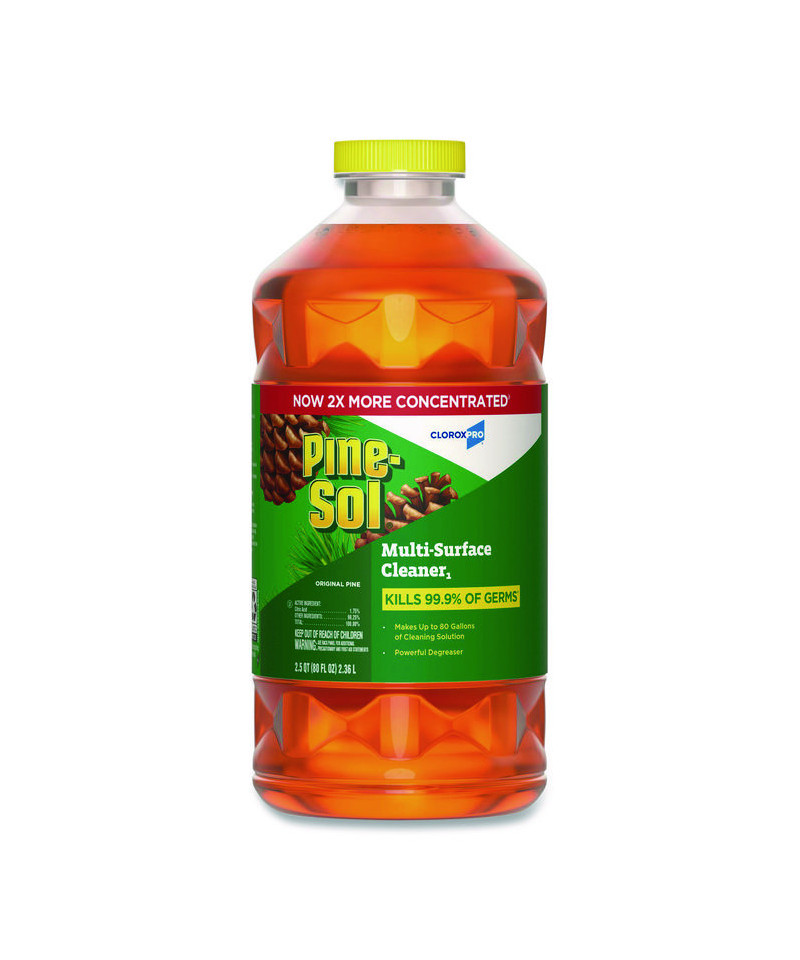 With Pine-Sol® Multi-Surface Cleaner Disinfectant Concentrated from CloroxPro®, you only need one product to fight tough dirt, grease and grime. A 2x concentrated formula delivers more cleaning power per drop than previous Pine-Sol® Pine formula. Easier to handle and easier to store, the space-saving bottle gives you more cleaning solution in a smaller bottle made of 30% less plastic. This multipurpose cleaner cleans, deodorizes and disinfects in one step, killing 99.9% of germs and leaving a classic scent. It cuts through grime and soap scum and is safe for use on wood, tile, stone, glass and more when used as directed on hard nonporous surfaces. Do not use on marble, aluminum, copper or wood that is unfinished, unsealed, unpainted, waxed, oiled or worn.