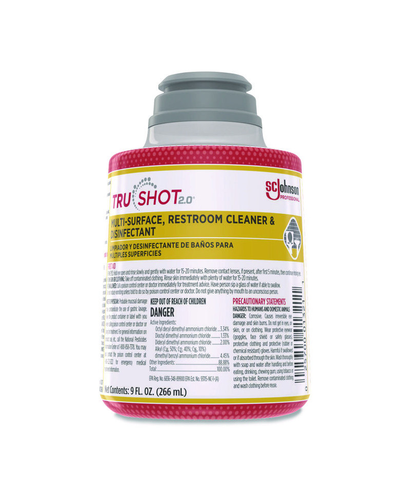 One step disinfectant for non-porous restroom surfaces. Effective against a broad spectrum of bacteria, viruses, fungi and inhibits the growth of mold and mildew. Use on washable hard, non-porous surfaces of toilets, tubs, tiles, walls, doorknobs, garbage cans, exterior appliances, tables, chairs, desks and countertops. This pre-labeled cartridge ensures you comply with OSHA workplace labeling compliance. TruShot 2.0® cartridges require no user mixing. The color- coded and easy to read cartridges simplify compliance, reduce off label usage.