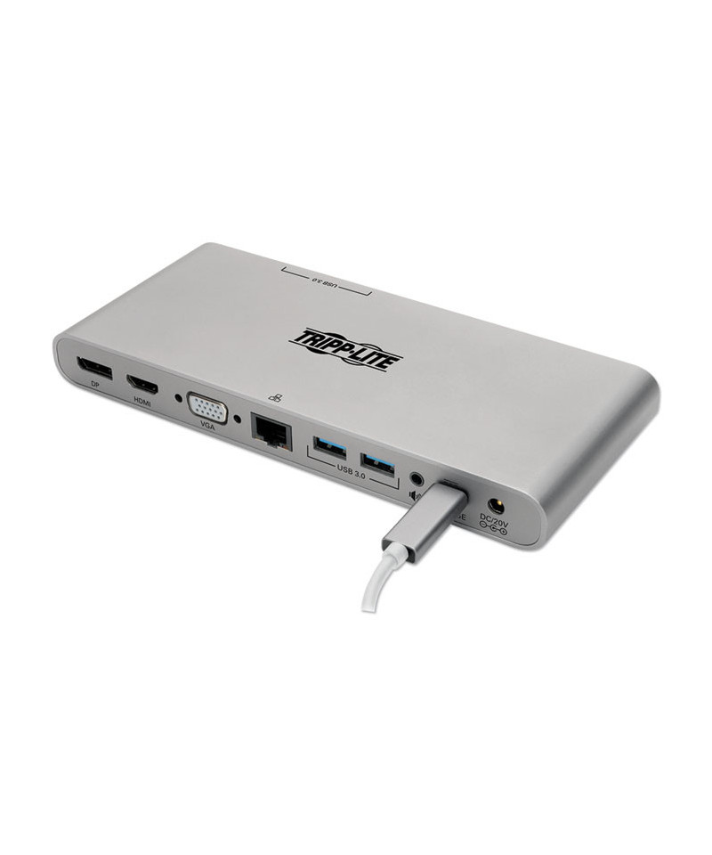 Docking station with PD charging adds HDMI, VGA, DP USB 3.1 ethernet and audio ports to your Chromebook, Macbook or PC. Transmits audio/video signals from sources supporting USB DisplayPort Alt mode. Supports UHD resolutions up to 3840 x 2160 @30Hz for crystal clear 4K x 2K video. Connects you to a wired 10/100/1000 Ethernet network when no Wi-Fi is available. Provides 20V 5A (100W) power output for fast-charging large-capacity mobile devices. Plug-and-play operation with no software required for easy immediate installation.