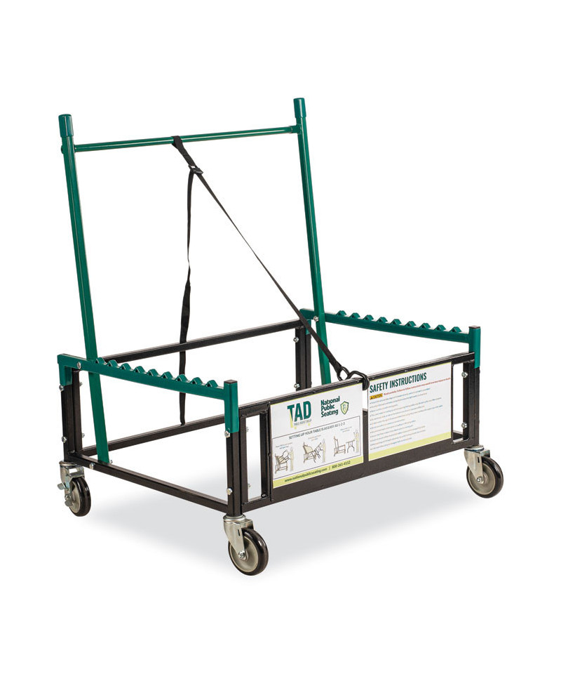 The Table Assist Dolly (TAD) dolly is an innovative unit that makes setting up and taking down tables all by yourself as easy as 1-2-3. The TAD works for rectangular folding tables of any size. This sturdy, tubular steel dolly boasts a 1,000 lb weight capacity and can be used for either up to 10 plastic folding tables or six wood folding tables. The textured scratch-resistant powder-coated paint finish along with plastic coated table support frames resists chipping even after years of rigorous use. All four hard-rubber casters swivel for easy maneuvering and two of them lock for secure table setting and take-down.