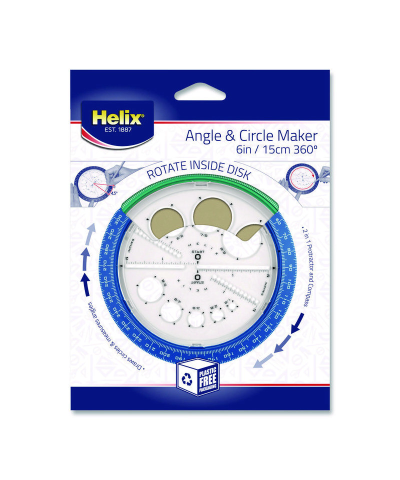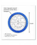The 360° Angle and Circle Maker combines three Geometry tools into one innovative and exciting product! The 6" diameter outer ring acts as a classic protractor, while the separate inner circle easily rotates to draw circles just like a compass. Eight integrated circle templates built into the inner ring are for drawing accurate small circles far easier than using a standard compass. Unique product is much easier for young children to manipulate and use than a standard compass, and the integrated design means that they can more easily understand how angles and measurements correspond with each other. The perfect tool for young students working on mastering geometry and angles.