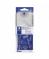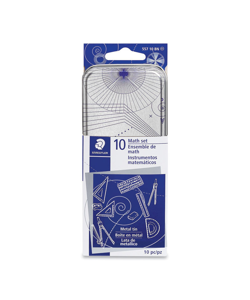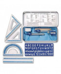Everything needed for higher-math classes—this precision instrument set is ideal for serious high-school and college students. Includes a standard/metric ruler, 180° protractor, 60° set square, 45° set square, safety-point scribe compass, loose-leg wing divider, woodcase pencil, pencil sharpener, block eraser and lettering guide. Handy metal storage case features imprinted conversion tables and geometric theorems.