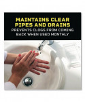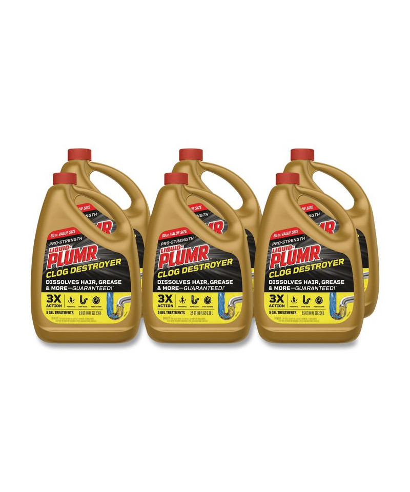 Get 3x action with Liquid-Plumr® Pro-Strength Clog Destroyer. This formula clears the toughest clogs and destroys, protects and prevents clogs with regular monthly use. Featuring Pipeguard Technology™ to prevent pipes from being damaged as the clog dissolves, this Liquid-Plumr® gel dissolves hair, grease and more and is safe for all pipes, including garbage disposals, plastic, metal, septic systems and older pipes. Whether you have a total blockage or a slow running drain, it works in the bathtub, public showers, bathroom sink, office sink and garbage disposal, and when used monthly prevents buildup and stops clogs from forming. For garbage disposals, follow same usage directions and flush with disposal running. Avoid all splashing.