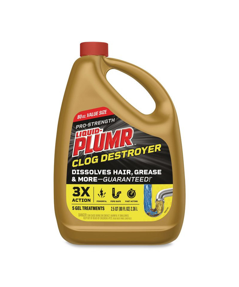 Get 3x action with Liquid-Plumr® Pro-Strength Clog Destroyer. This formula clears the toughest clogs and destroys, protects and prevents clogs with regular monthly use. Featuring Pipeguard Technology™ to prevent pipes from being damaged as the clog dissolves, this Liquid-Plumr® gel dissolves hair, grease and more and is safe for all pipes, including garbage disposals, plastic, metal, septic systems and older pipes. Whether you have a total blockage or a slow running drain, it works in the bathtub, public showers, bathroom sink, office sink and garbage disposal, and when used monthly prevents buildup and stops clogs from forming. For garbage disposals, follow same usage directions and flush with disposal running. Avoid all splashing.