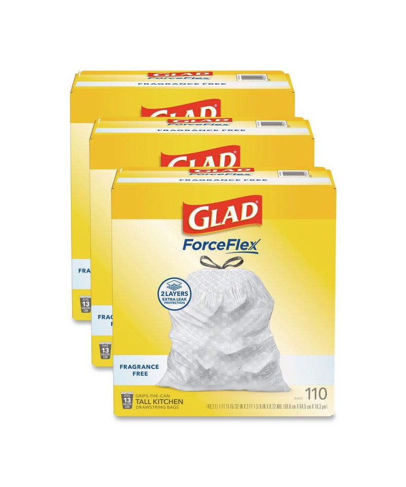 Let the stretchable strength of Glad® ForceFlex™ handle all the messes our busy daily life can throw at it and then some. Glad® Tall Kitchen Drawstring Trash Bags are designed with ForceFlex™ technology to give extra flex as it expands around sharp edges and heavy loads, so you can pack it in while resisting tears, rips and punctures. These trash bags are designed with two layers for extra leak protection. RipGuard® and LeakGuard® technology prevent seepage of liquids and keep trash contained. Fight nasty kitchen odors with the exclusive Glad® trash bag combination of steady release of Febreze freshness and irresistible scent that traps, locks and neutralizes odors. The durable Grips The Can Drawstring ensures a tight grip on the trash can to keep it in place. Take the trash to the curb with no fear of leaks and tears, and no frustration.