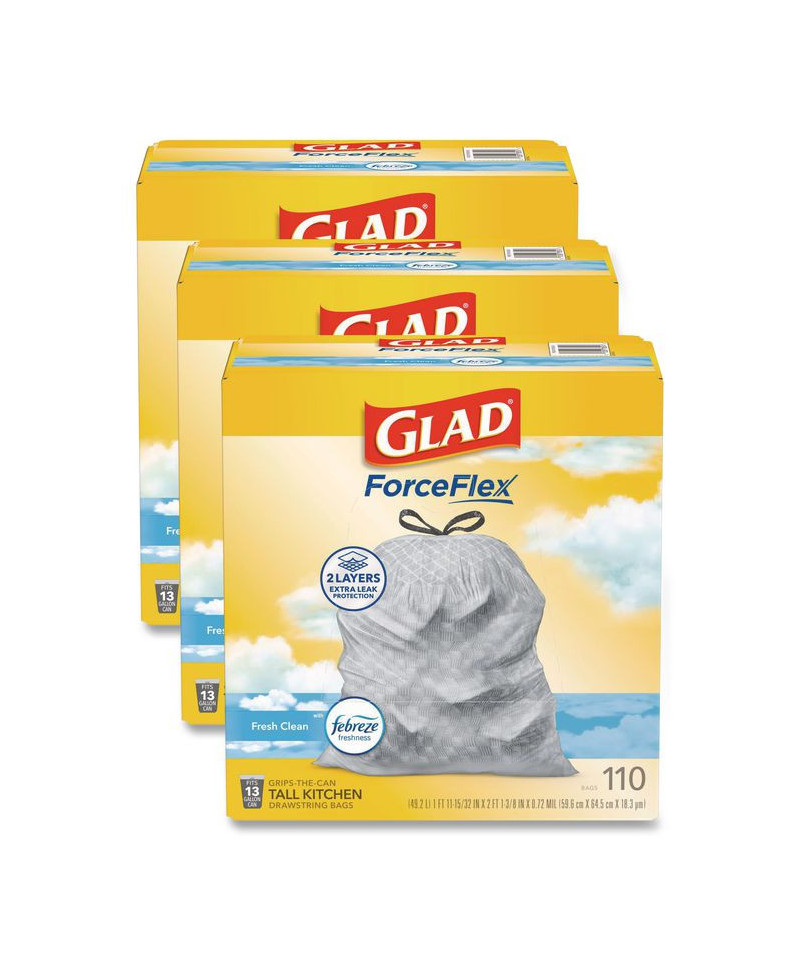 Let the stretchable strength of Glad® ForceFlex™ handle all the messes our busy daily life can throw at it and then some. Glad® Tall Kitchen Drawstring Trash Bags are designed with ForceFlex™ technology to give extra flex as it expands around sharp edges and heavy loads, so you can pack it in while resisting tears, rips and punctures. These trash bags are designed with two layers for extra leak protection. RipGuard® and LeakGuard® technology prevent seepage of liquids and keep trash contained. Fight nasty kitchen odors with the exclusive Glad trash bag combination of steady release of Febreze freshness and irresistible Fresh Clean scent that traps, locks and neutralizes odors. The durable Grips The Can Drawstring ensures a tight grip on the trash can to keep it in place. Take the trash to the curb with no fear of leaks and tears, and no frustration.