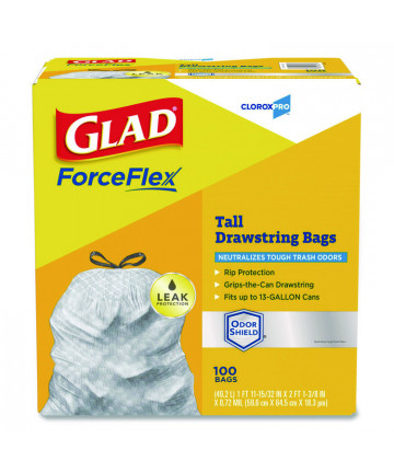 Prevent the spread of odor-causing bacteria with Glad®. These OdorShield® bags provide lasting freshness as it continuously neutralizes nasty kitchen odors. The ForceFlex™ technology delivers extra toughness as it flexes and expands around sharp edges and heavy loads without ripping. Featuring RipGuard and LeakGuard technology, these trash bags guard against punctures and tears, and traps liquids in the bag so you can put your most demanding trash up for the challenge. Let the stretchable strength of Glad handle all the messes our busy daily life can throw at it and then some. The Grips-The-Can Drawstring ensures that the bag stays in place, until you are ready to take it out. The 13 gallon size is perfect for the kitchen or throughout the office and is great for your seasonal cleaning needs like Spring Cleaning and Back to School. Packaging may vary.