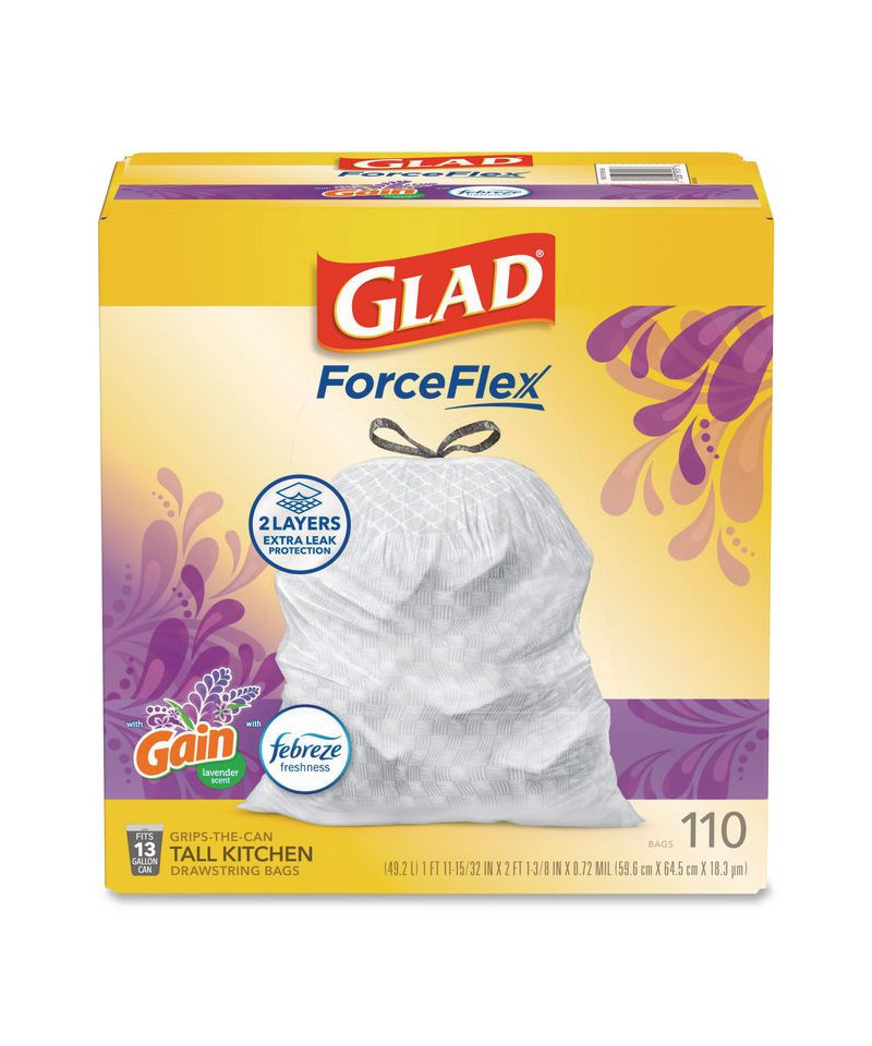 Let the stretchable strength of Glad® ForceFlex™ handle all the messes our busy daily life can throw at it and then some. Glad® Tall Kitchen Drawstring Trash Bags are designed with ForceFlex™ technology to give extra flex as it expands around sharp edges and heavy loads, so you can pack it in while resisting tears, rips and punctures. These trash bags are designed with two layers for extra leak protection. RipGuard® and LeakGuard® technology prevent seepage of liquids and keep trash contained. Fight nasty kitchen odors with the exclusive Glad trash bag combination of steady release of Febreze freshness and irresistible Fresh Clean scent that traps, locks and neutralizes odors. The durable Grips The Can Drawstring ensures a tight grip on the trash can to keep it in place. Take the trash to the curb with no fear of leaks and tears, and no frustration.