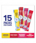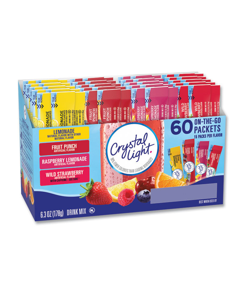 Crystal Light® Variety Pack Drink Mixes are fruity beverages you can enjoy anywhere. With zero grams of sugar and five or ten calories (depending on flavor) per packet, Crystal Light® has 90% fewer calories than leading beverages, so you don't have to choose between taste and calories. Each variety pack includes 15 lemonade, 15 fruit punch, 15 raspberry lemonade and 15 wild strawberry with caffeine drink mixes. The individual packets of powdered drink mix fit easily in your bag, desk, or car, so you can enjoy a refreshing glass of Crystal Light® anywhere. Simply empty one packet from our 60-count box into a bottle of water or a glass with two cups of water, shake or stir, and enjoy!