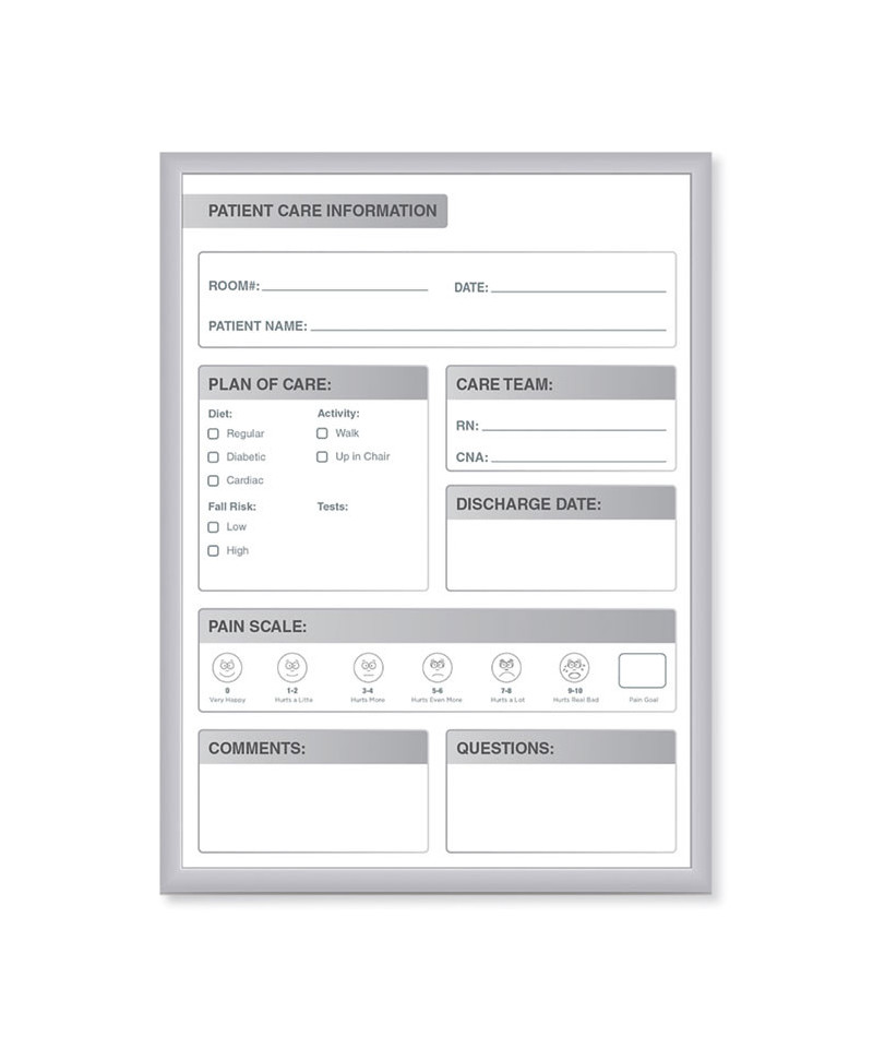 Patient room whiteboard is visually enhanced and will not ghost or stain. Soft gray graphics blend with hospital design and the researched design encourages patient and staff communication, effective in increasing HCHAPS scores and reducing patient anxiety. There is plenty of room to write in each patient's procedure details. The graphics improve communication and reduce anxiety for patients and employees. The entire dry-erase surface easily wipes off with a soft cloth, disinfectant wipe, alcohol or water. These whiteboards are resistant to bacteria and germs, which helps with infection prevention. Each board comes in a sleek 0.25 aluminum frame and includes a detached SmartPak tray. Ships to you in Ghent's worry-free packaging, designed specifically for shipping whiteboards.