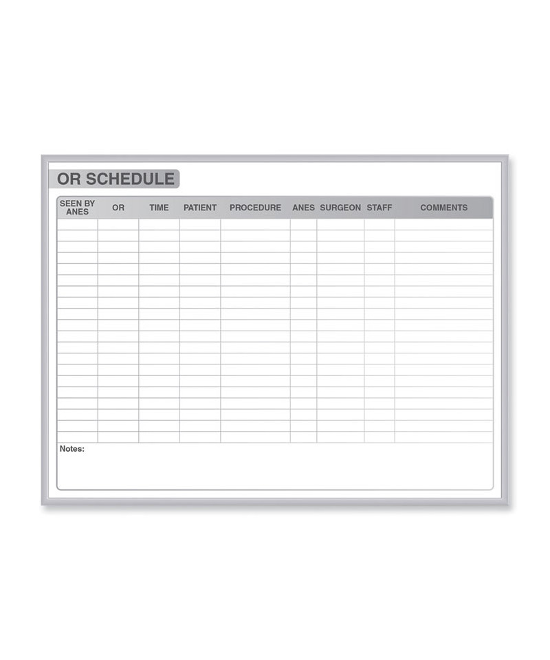 Ghent's graphic whiteboard is visually enhanced to encourage communication and collaboration. Ghent's OR schedule board helps keep track of surgeries and patient details for your operating room. There is plenty of room to write in each patient's procedure details. The graphics on the erasable board improves communication and reduce anxiety for patients and employees. The entire dry-erase surface easily wipes off with a soft cloth, disinfectant wipe, alcohol or water. Ghent's graphic whiteboards are resistant to bacteria and germs, which helps with infection prevention. Each board comes in a sleek 0.25 aluminum frame and includes a detached SmartPak tray. Graphics are produced in gray to seamlessly match any interior and will never stain, ghost or fade. Ships to you in Ghent's worry-free packaging, designed specifically for shipping whiteboards.