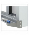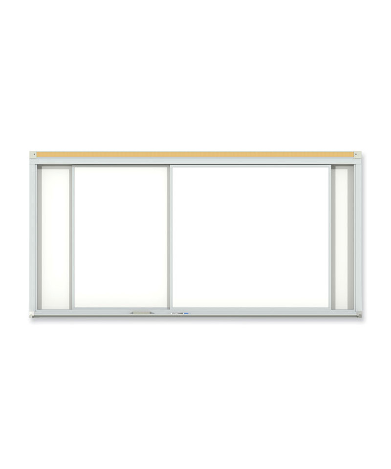Ghent's Horizontal Slider provides a panel system with multiple dry-erase whiteboard panels to serve a multitude of needs, doubling the usable space. Two top-suspended panels glide on nylon rollers for smooth operation. The porcelain-on-steel writing surface creates a durable, high-performance whiteboard. It accepts magnets and resists scratches and stains. The board is constructed with heavy-duty anodized aluminum trim and includes a 2 natural cork map rail. Porcelain writing surface carries Ghent's 50-year guarantee.