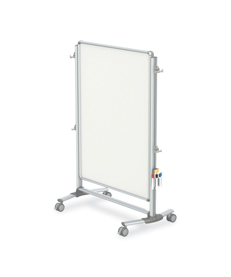 Movable display panel provides flexibility to create temporary walls. Partition features a double-sided magnetic whiteboard surface for a reusable and greener solution than traditional chart pads. Presentation options are expandable with side pegs that accommodate up to four tablets (sold separately). The angled foot design allows for easy grouping. Units come complete with four markers, one eraser and a side-mountable holder.