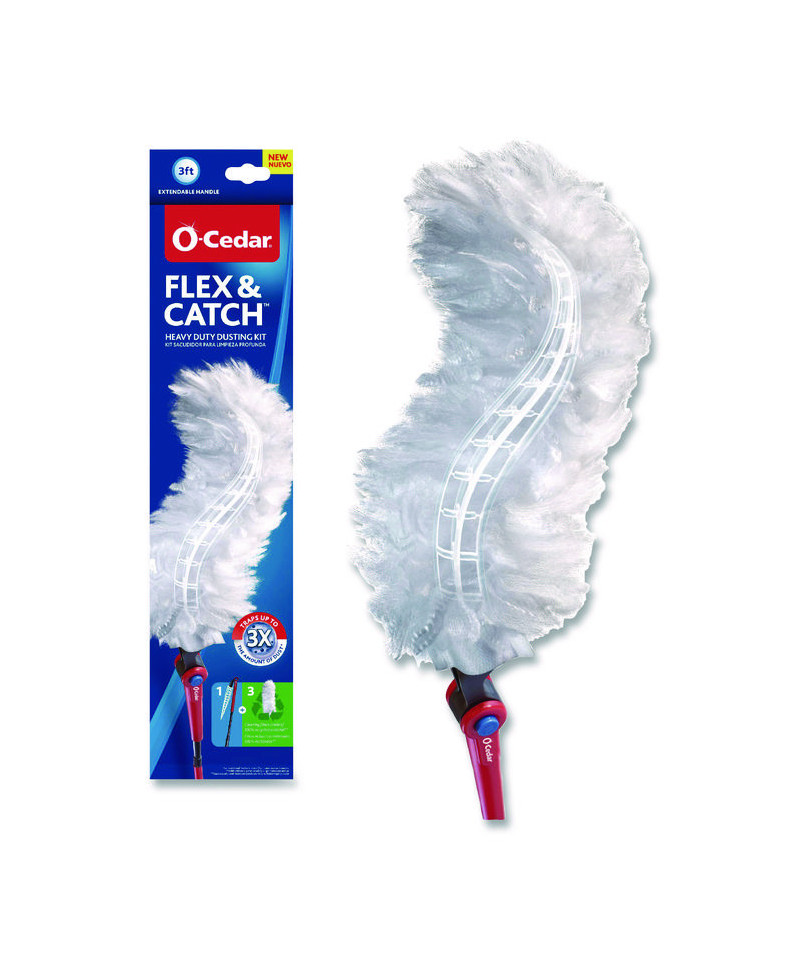 Trap dust in even the most hard-to-reach places with the O-Cedar Flex & Catch Heavy Duty Dusting Kit. This ultra-flexible duster features a patented head that contours around objects, trapping up to three times more dust than traditional feather dusters. The handle extends three feet, helping you reach high places, and the swivel head locks into six different positions so you can customize your cleaning angle. The Flex & Catch kit comes with three disposable refills, featuring cleaning fibers made from recycled materials. Plus the convenient hook helps keep the refill in place–just loop the refill onto the hook and give it a little tug to keep it secure while dusting. When you're finished dusting, it folds down for easy storage.