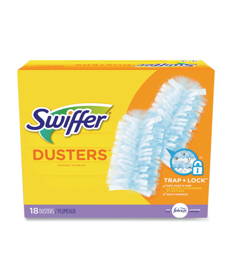 Swiffer Dusters TRAP + LOCK dust wherever dust shows up, including fan blades, blinds, car interior, keyboard vents, bookcases, and more. They are made with specially coated fibers that grab onto dust and don't let go. Enjoy the lasting freshness of Gain as you clean. Leaves behind up to one hour of freshness after initial product use.